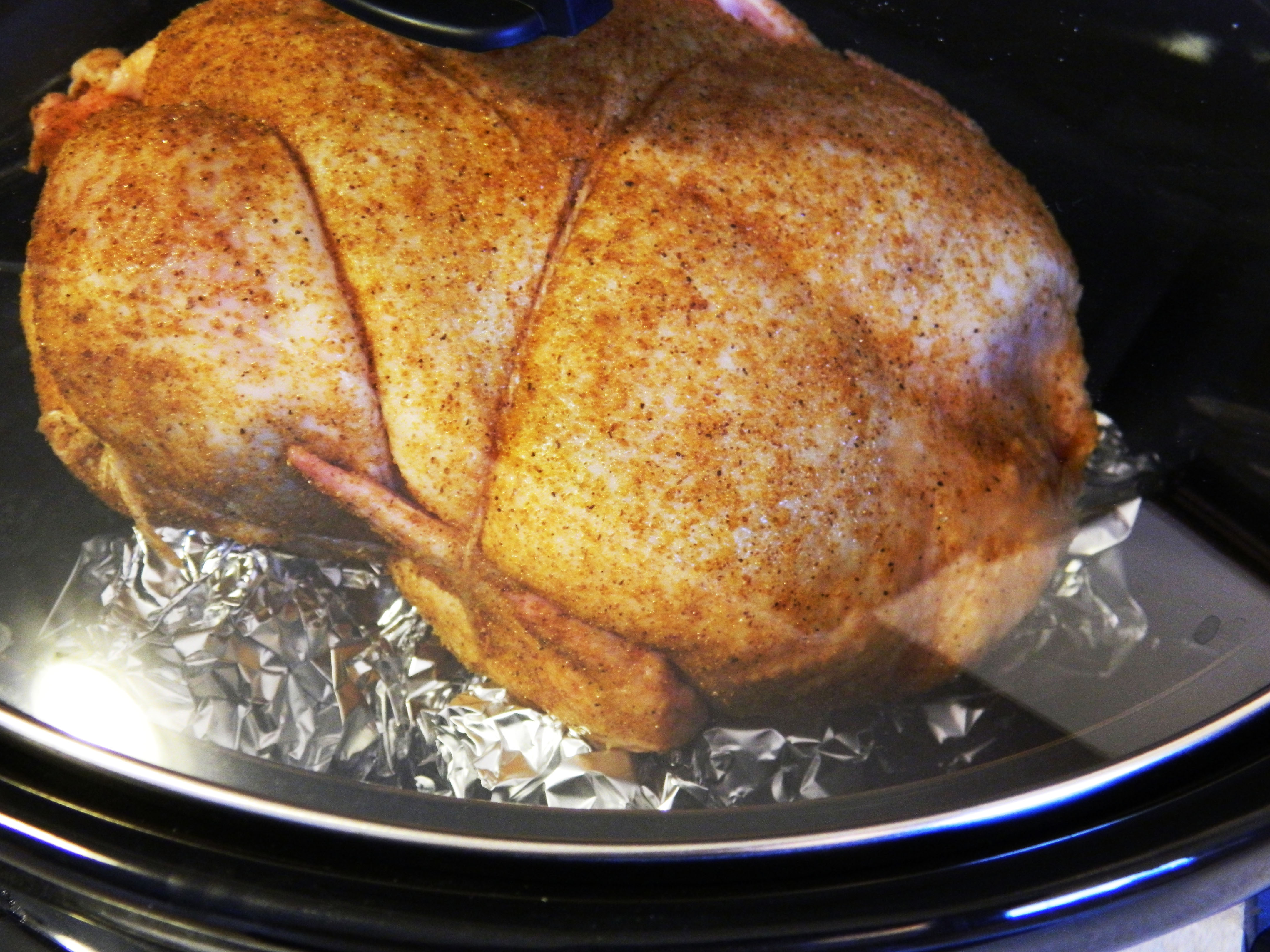 Summer Shortcut Roast Chicken | baconavecbacon.comWash and dry your chicken. Season well. Get out your crock pot and a roll of tinfoil. Crumple 4-5 sheets of tinfoil into baseball sized balls and place them in the bottom of the crock pot. Place your chicken on top and cook on high for approximately 5 hours.