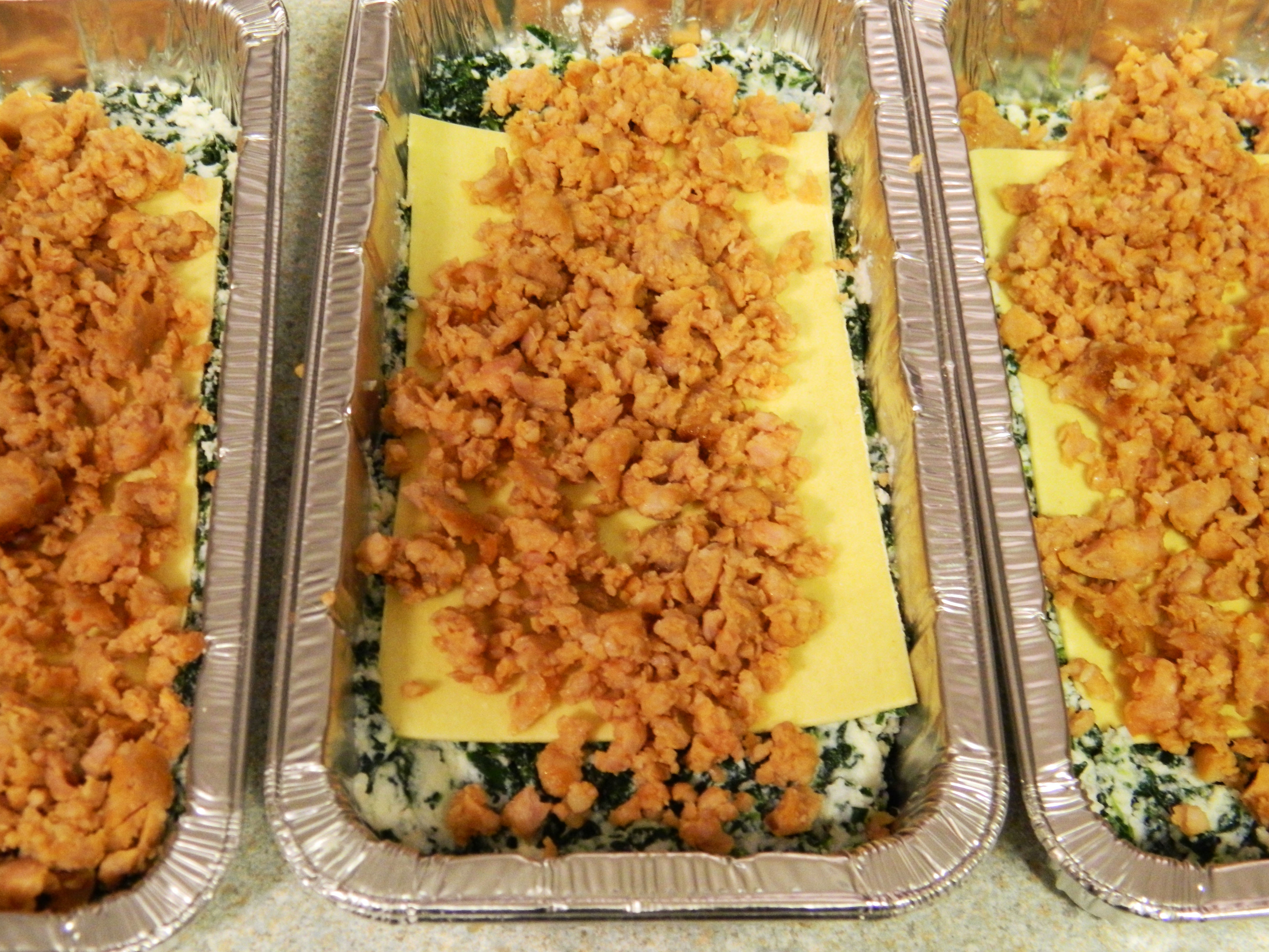 Now you can begin building your lasagna one layer at a time. When I’m splitting lasagnas into three pans, I do one layer at a time over all three pans. Here is how to assemble it: